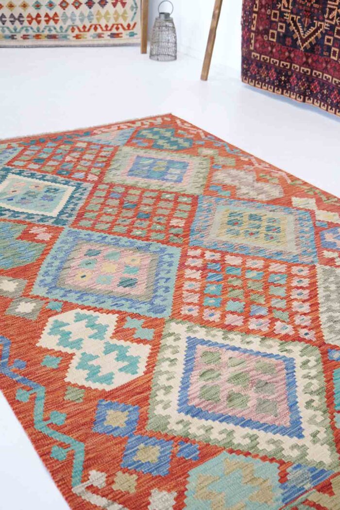 Afghanske kelimer er tradisjonelle håndvevde tepper fra Afghanistan, kjennetegnet ved sine livlige geometriske mønstre og farger. De er laget med flate vevteknikker, uten luv, som gir en glatt, slitesterk overflate. I motsetning til persiske tepper, som ofte har detaljerte blomsterdesign, har afghanske kelimer et mer rustikt og geometrisk utseende, inspirert av det nomadiske livet og de omkringliggende landskapene.