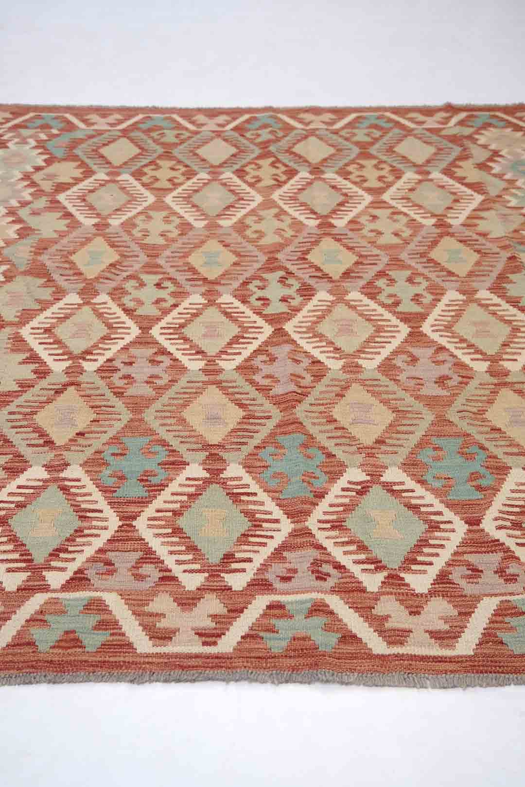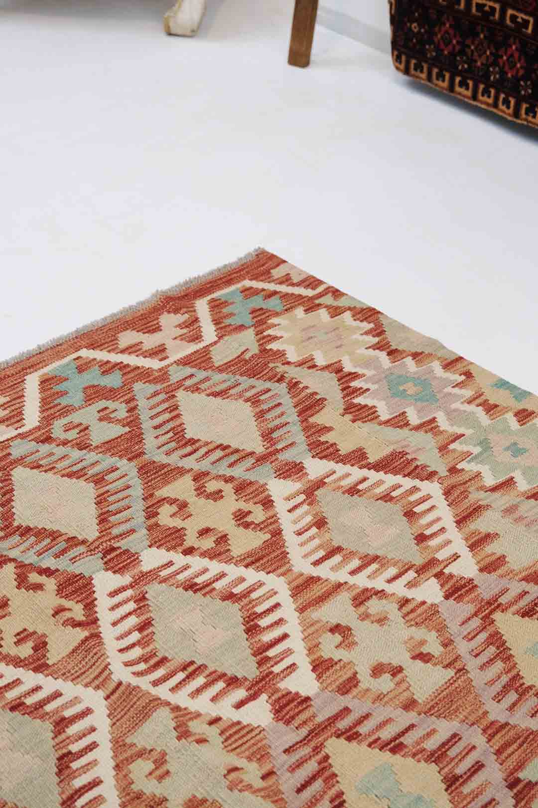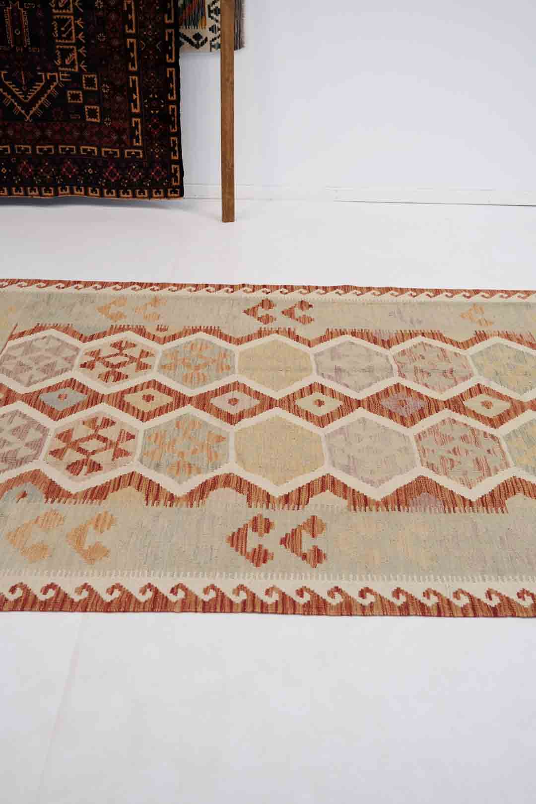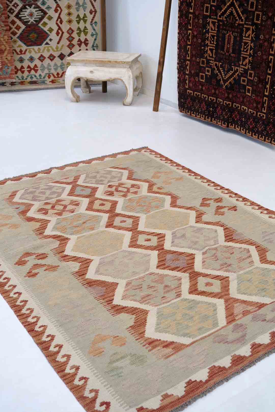 Denne kelimen er vevd i maymaneh distriktet i nord Afghanestan av håndspunnet og plantefarget ull.