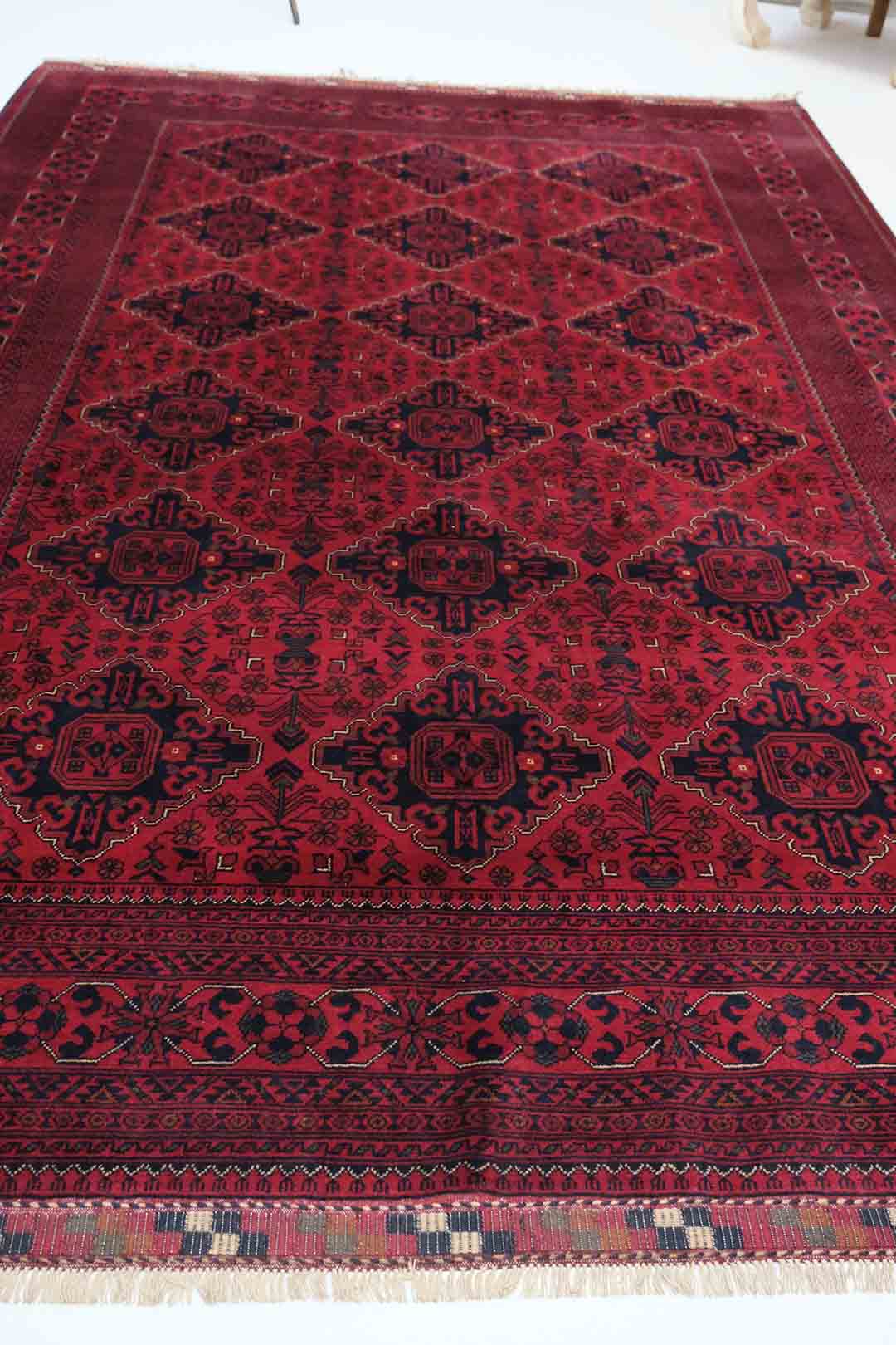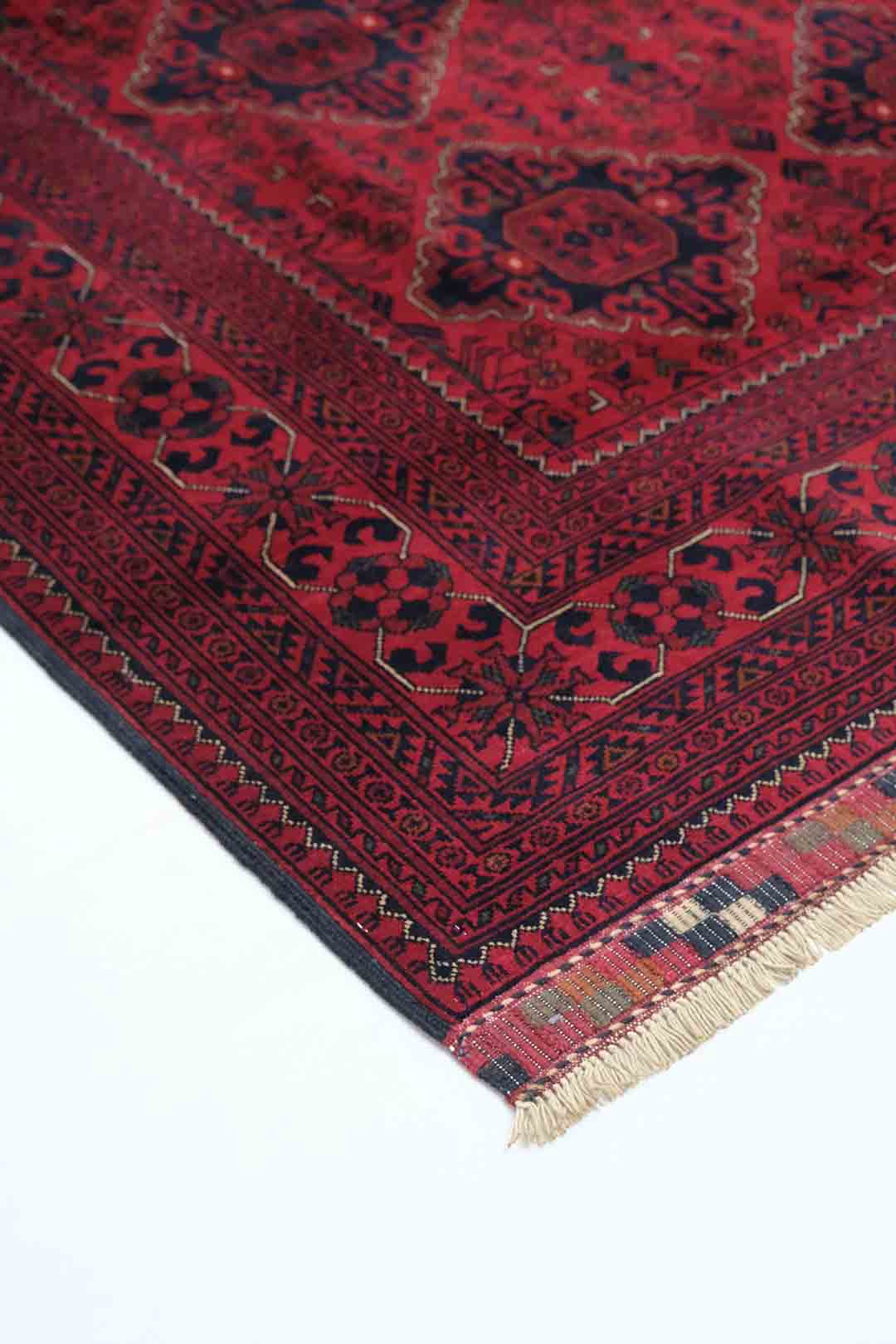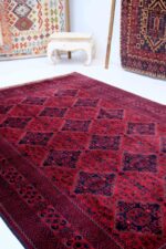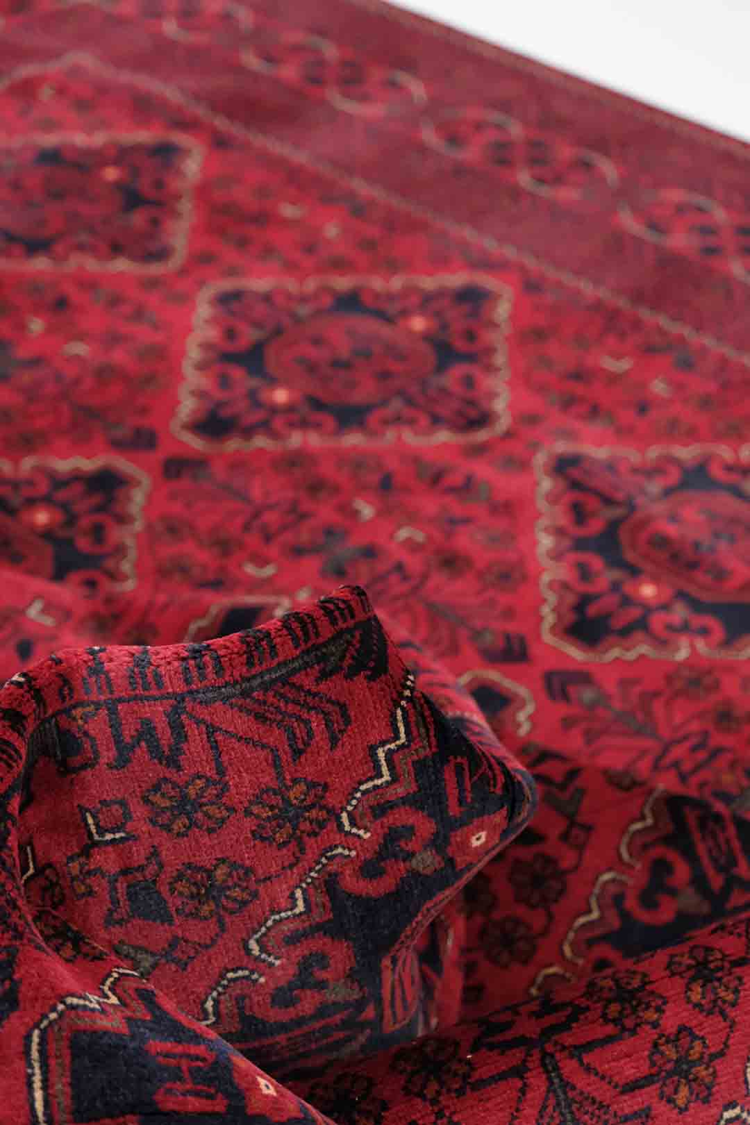 Afghanske Khan Mohammadi-tepper er tradisjonelle, håndknyttede tepper som stammer fra det nordlige Afghanistan, spesielt fra provinsene rundt byene Kunduz og Mazar-e Sharif. Disse teppene er kjent for sin utrolige kvalitet og solide håndverk. Typisk har Khan Mohammadi-tepper dype, varme farger som mørkerød, mørk blå og brune toner, ofte med geometriske mønstre og små detaljer som gjentas i hele teppet. Mønstrene har en sterk symbolikk og er inspirert av afghansk kultur og historie.