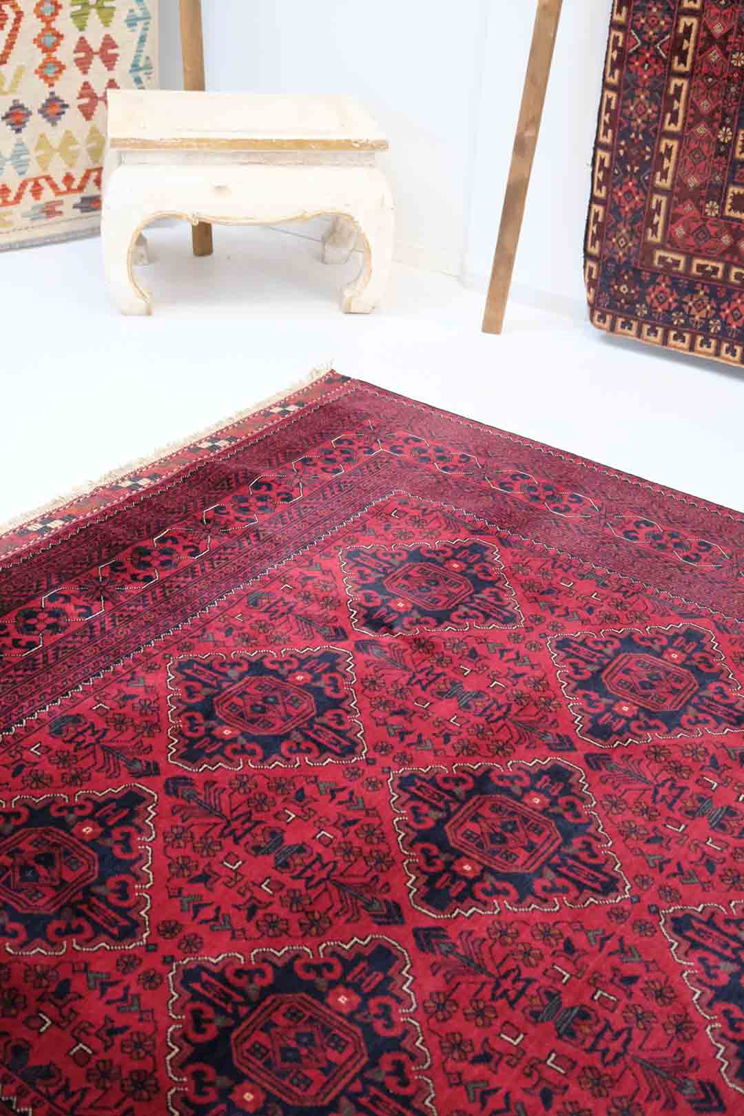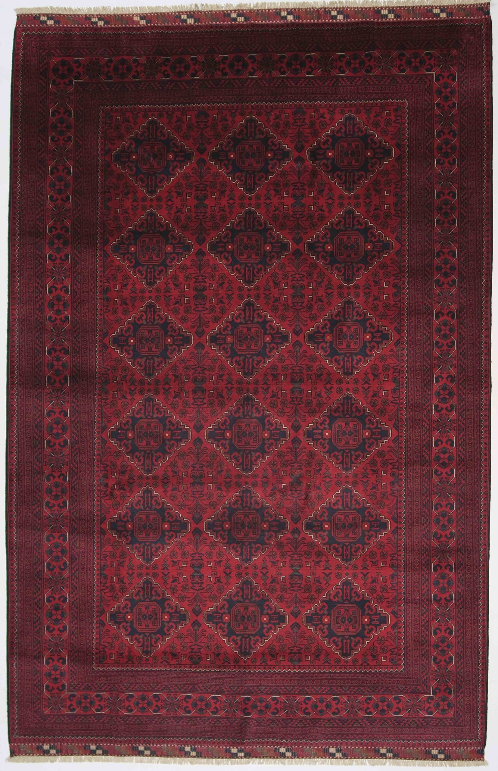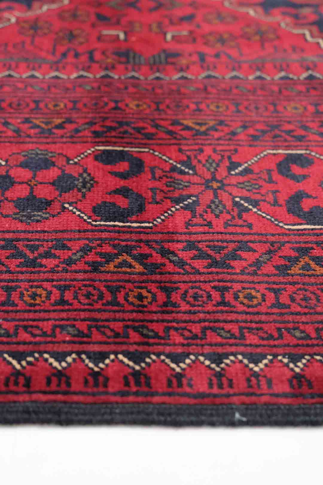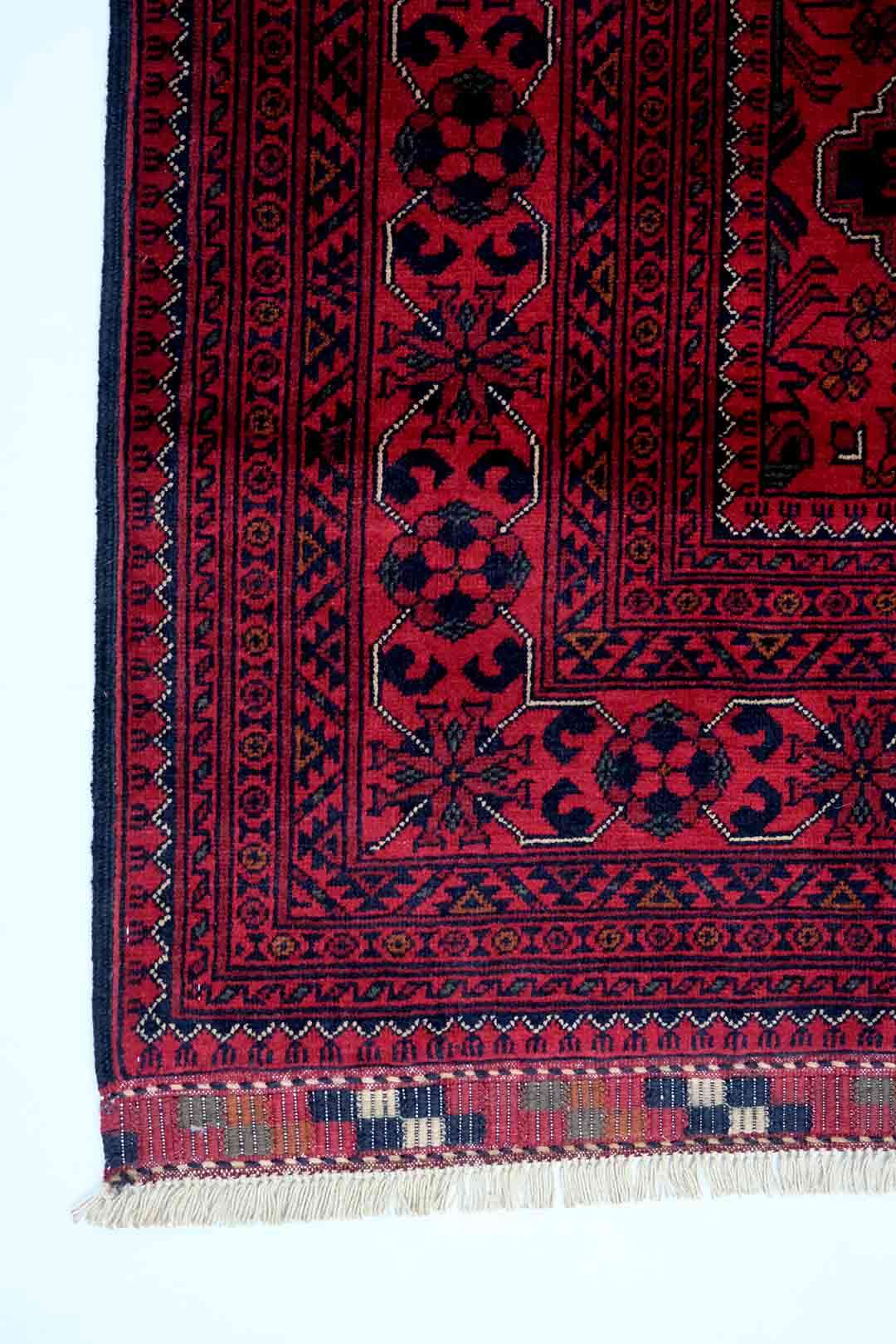 Afghanske Khan Mohammadi-tepper er tradisjonelle, håndknyttede tepper som stammer fra det nordlige Afghanistan, spesielt fra provinsene rundt byene Kunduz og Mazar-e Sharif. Disse teppene er kjent for sin utrolige kvalitet og solide håndverk. Typisk har Khan Mohammadi-tepper dype, varme farger som mørkerød, mørk blå og brune toner, ofte med geometriske mønstre og små detaljer som gjentas i hele teppet. Mønstrene har en sterk symbolikk og er inspirert av afghansk kultur og historie.
