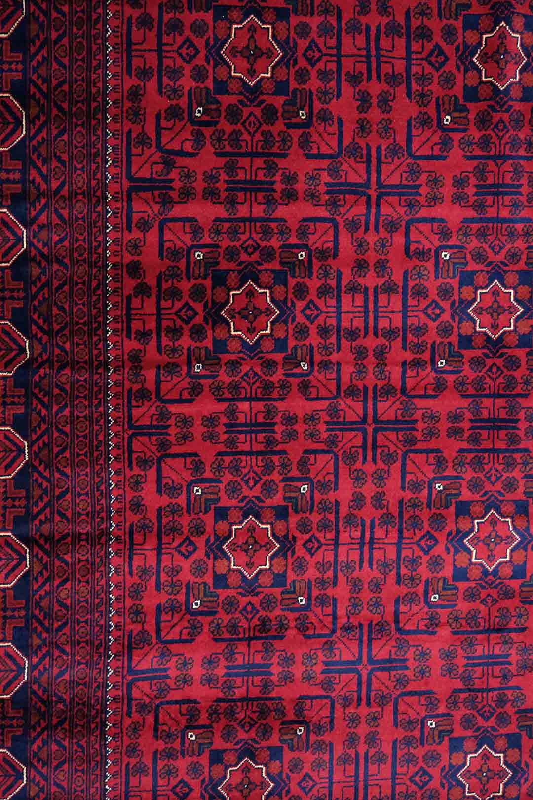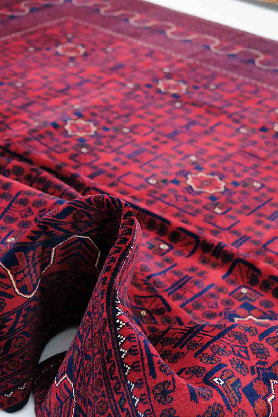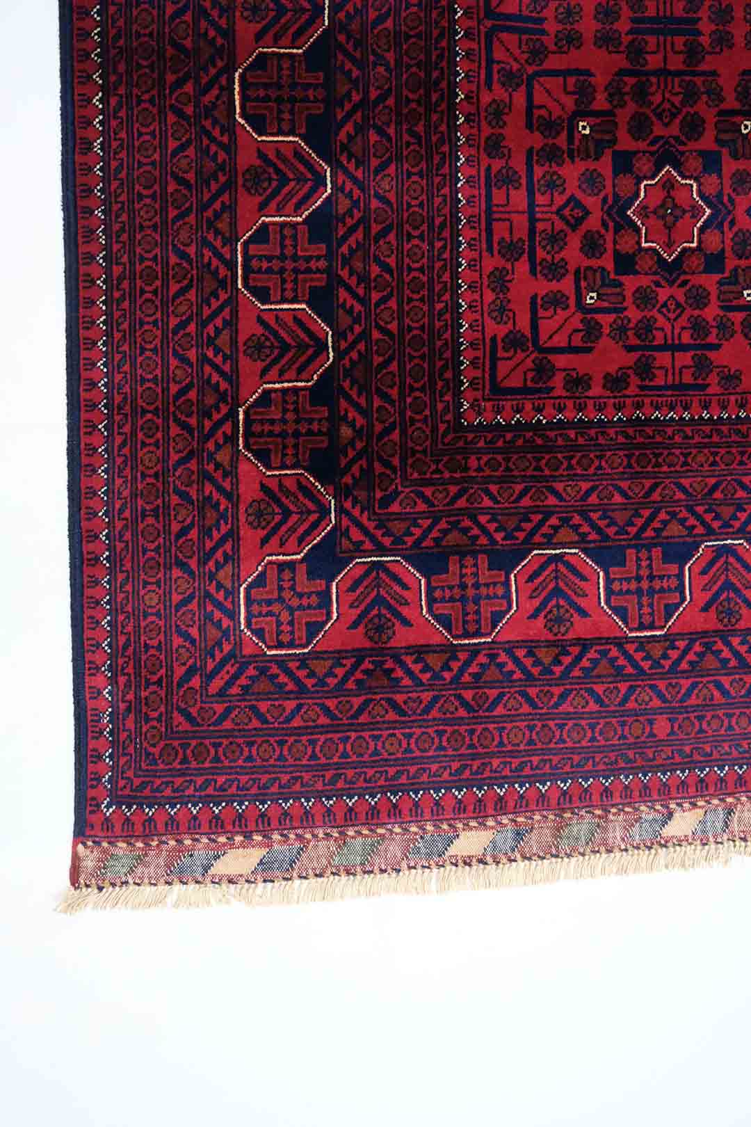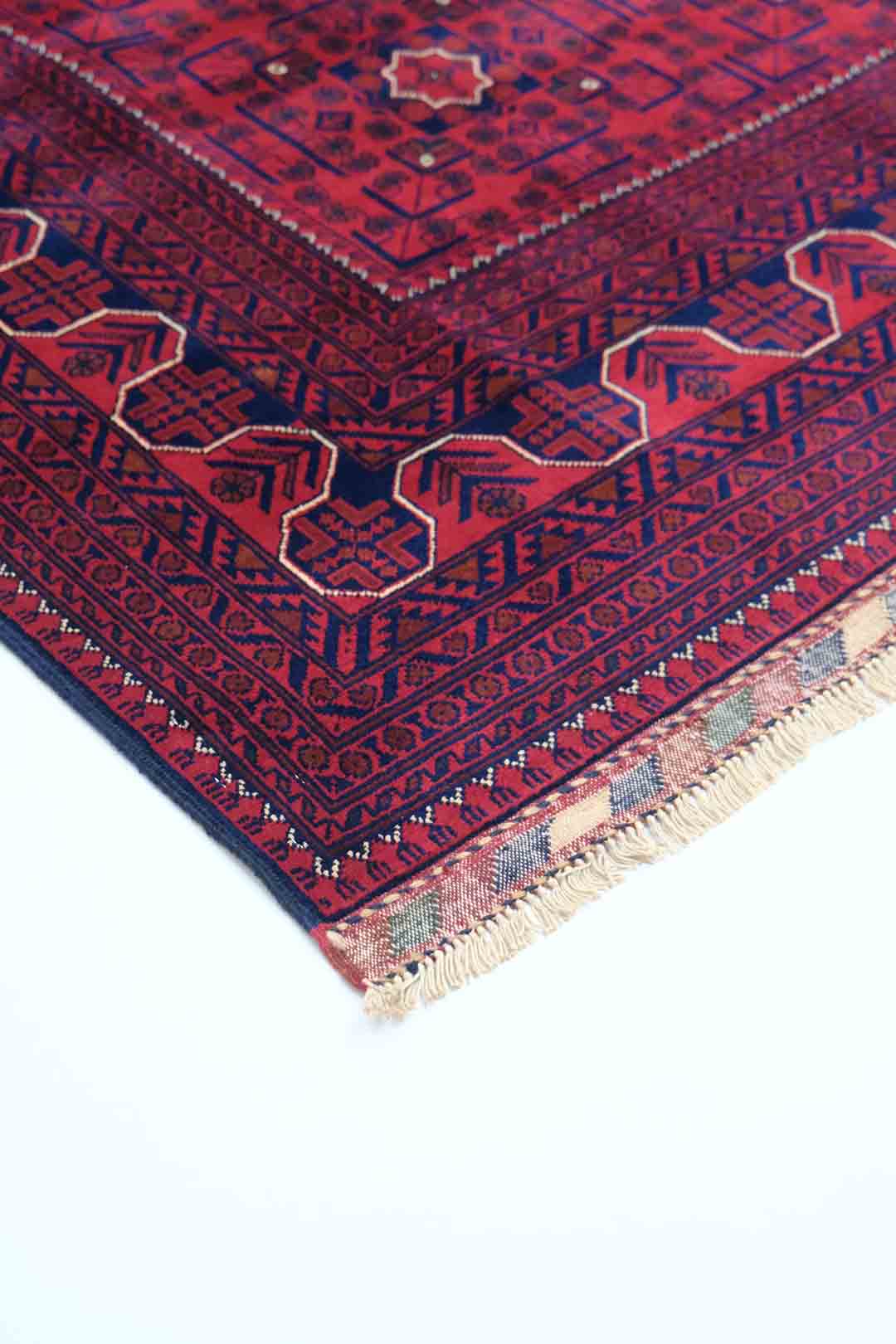 Afghanske Khan Mohammadi-tepper er tradisjonelle, håndknyttede tepper som stammer fra det nordlige Afghanistan, spesielt fra provinsene rundt byene Kunduz og Mazar-e Sharif. Disse teppene er kjent for sin utrolige kvalitet og solide håndverk. Typisk har Khan Mohammadi-tepper dype, varme farger som mørkerød, mørk blå og brune toner, ofte med geometriske mønstre og små detaljer som gjentas i hele teppet. Mønstrene har en sterk symbolikk og er inspirert av afghansk kultur og historie.