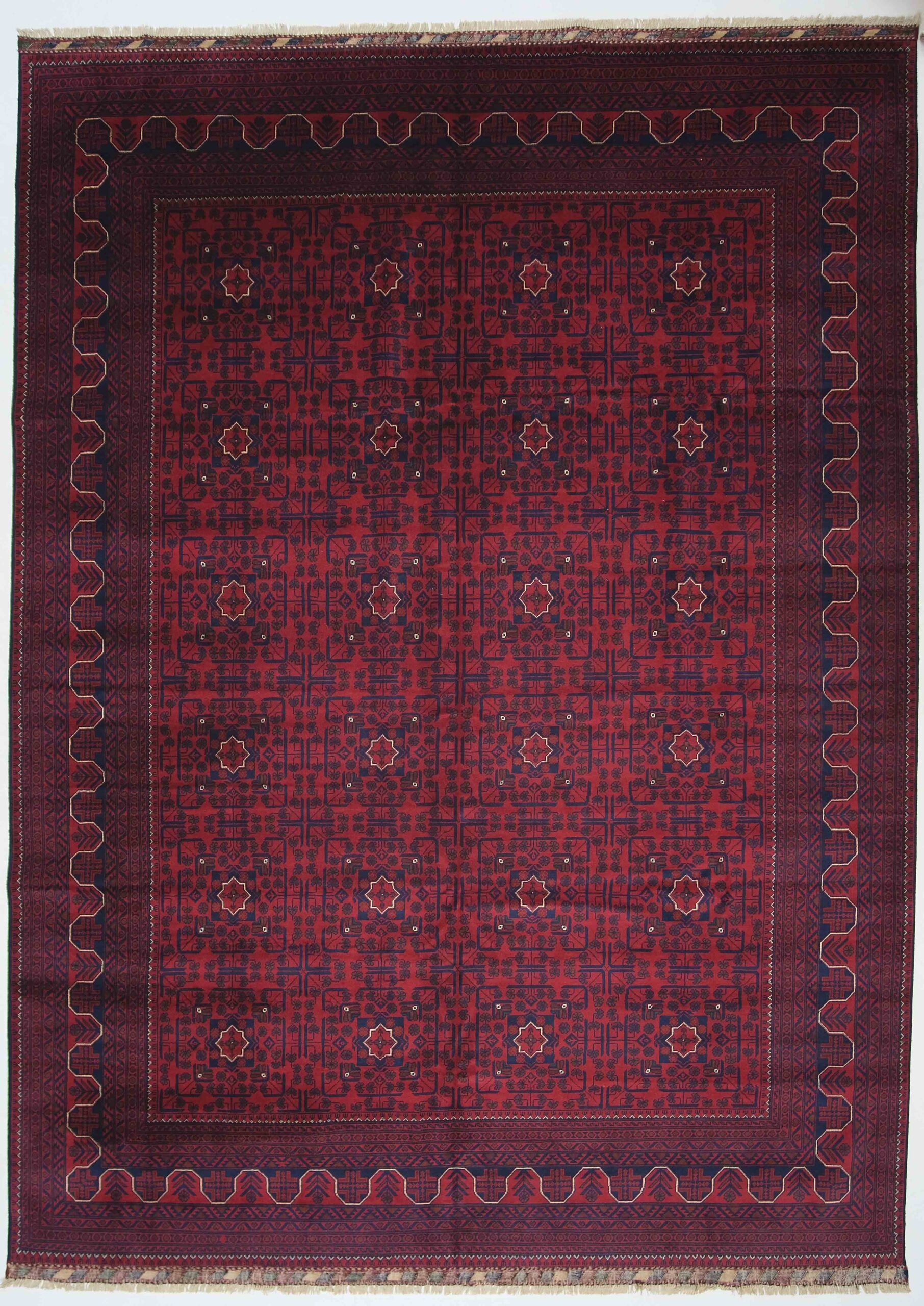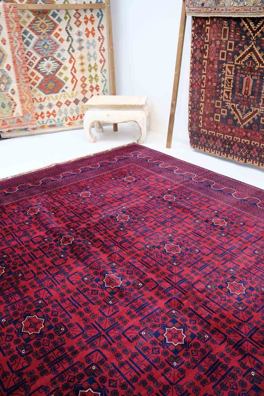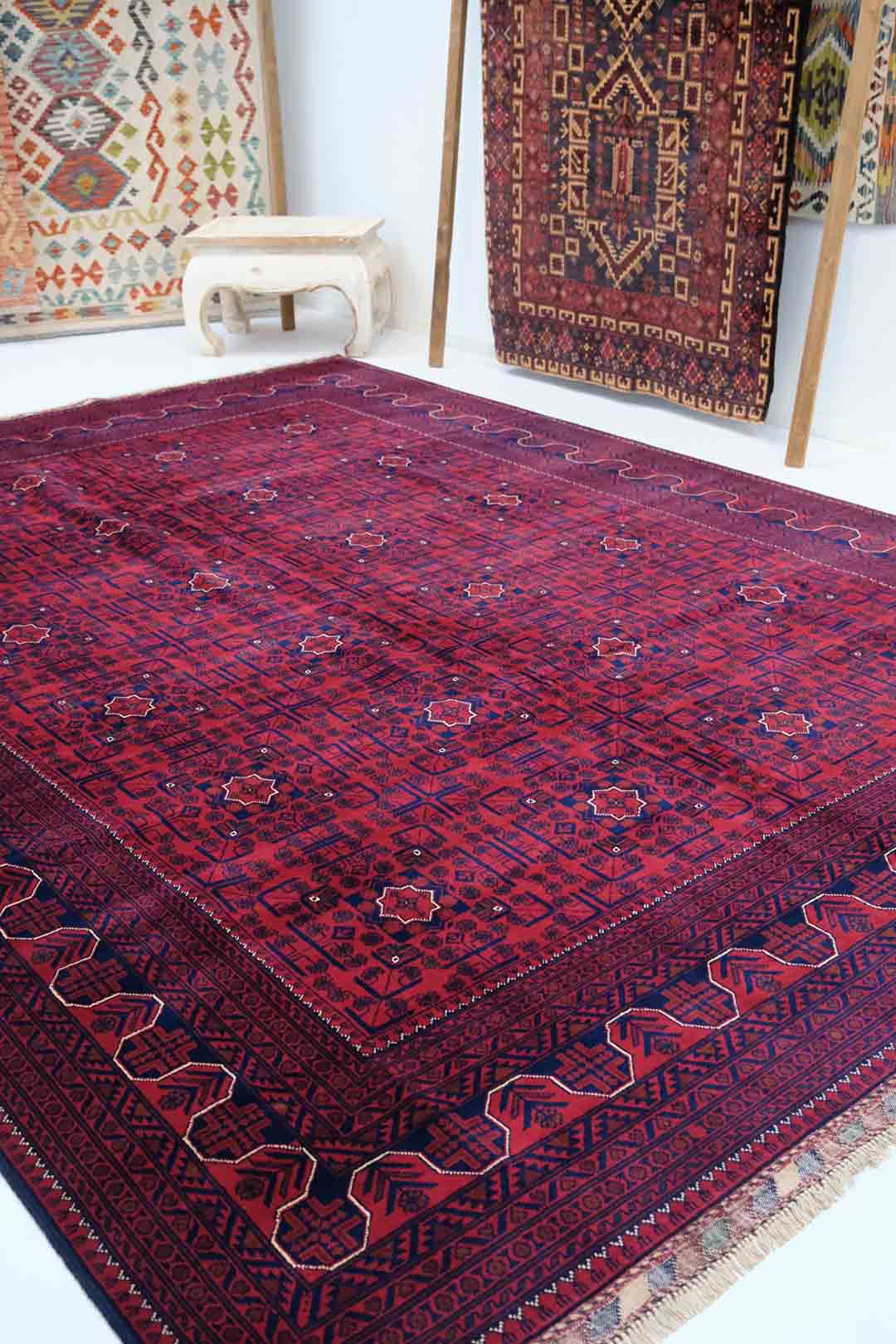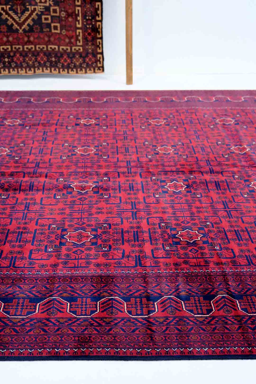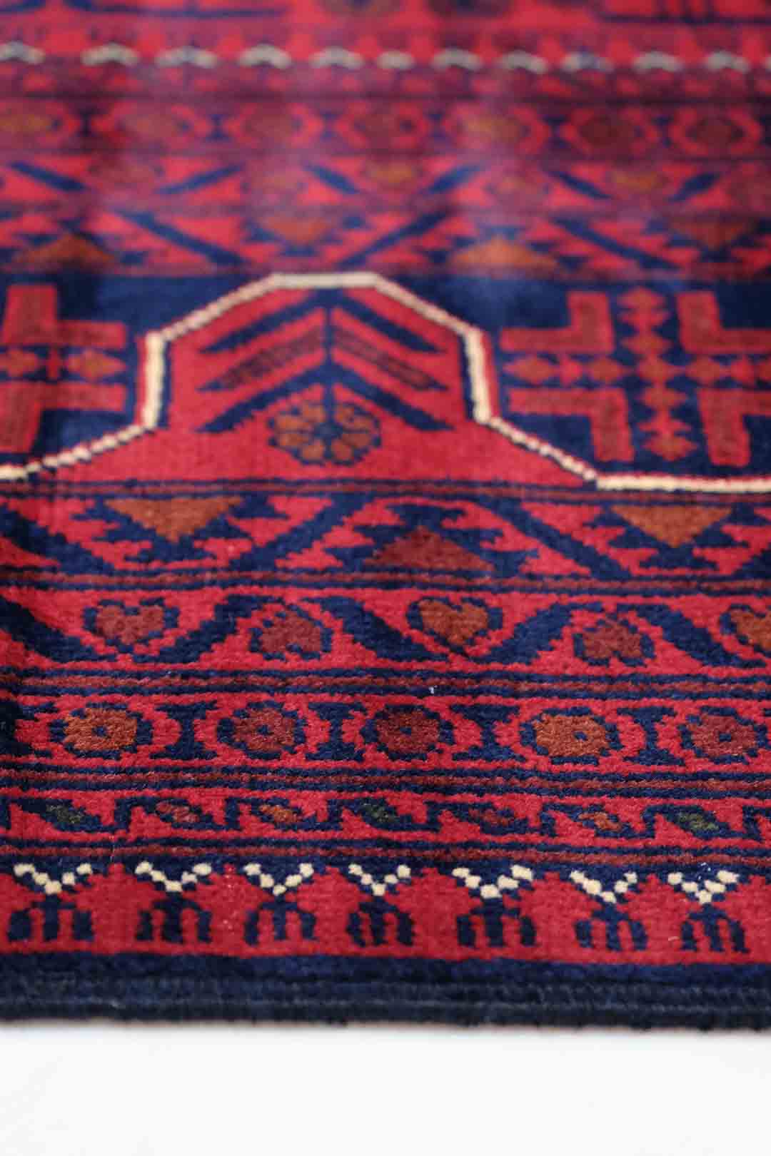 Afghanske Khan Mohammadi-tepper er tradisjonelle, håndknyttede tepper som stammer fra det nordlige Afghanistan, spesielt fra provinsene rundt byene Kunduz og Mazar-e Sharif. Disse teppene er kjent for sin utrolige kvalitet og solide håndverk. Typisk har Khan Mohammadi-tepper dype, varme farger som mørkerød, mørk blå og brune toner, ofte med geometriske mønstre og små detaljer som gjentas i hele teppet. Mønstrene har en sterk symbolikk og er inspirert av afghansk kultur og historie.