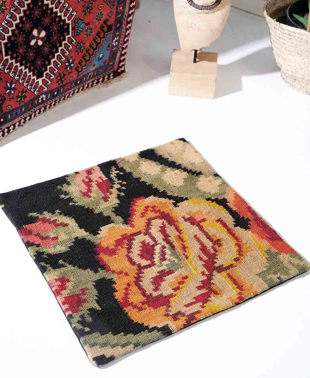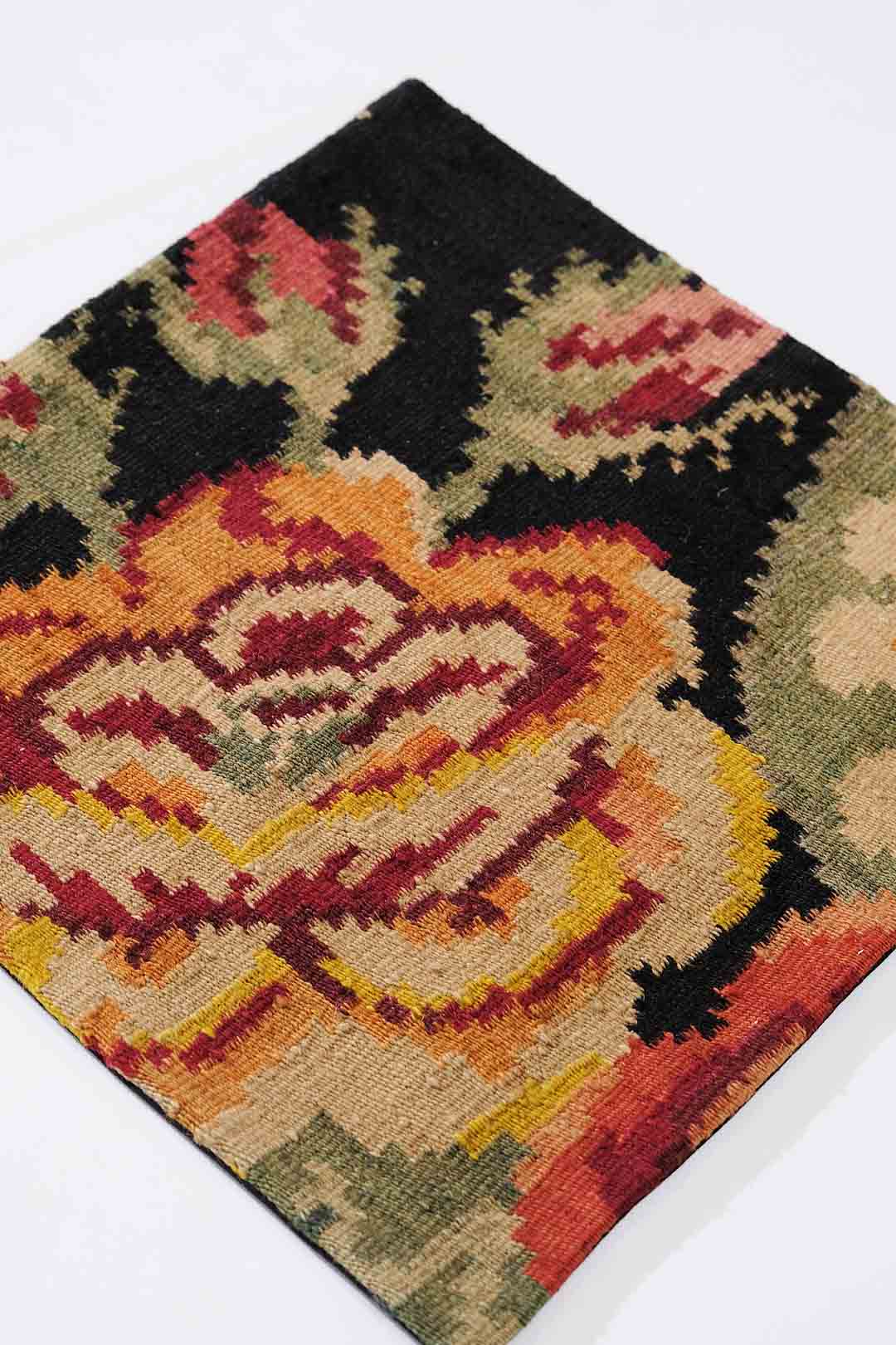 Dette er et rosekelim pute laget av gamle rosekelimer fra Moldova. Det er ull på ull renning , ullen er plante farget og håndspunnet.